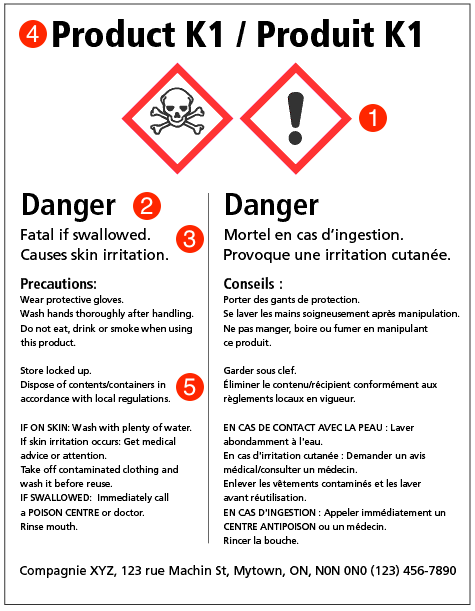 Labels must be in English and French. They may be bilingual (as one label) or presented as two labels (one each in English and French), and the pictogram(s), signal word and hazard statement(s) must be grouped together on a label.
